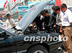 六月,北京“非典”疫情逐步得到控制,北方汽车交易市场客流量回升,十万元左右的轿车销路看好。图为汽车销售人员正在为用户介绍国产轿车的性能。中新社记者 张勤 摄