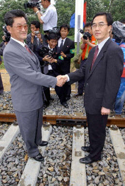 两国铁路连接于2000年6月15日签订协议,原定去年完成连接,但由于朝鲜的核计划问题而推迟到今天。尽管铁路已经联起来了,但在火车通行前还要安装电子和信号设备。