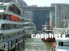 三峡工程双线五级永久船闸昨天进行第一阶段实船试验的第二次试验,五艘不同类型的船舶以集体进入同一闸室的方式进行实船试验。