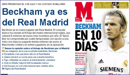 英国报纸指出,贝克汉姆转会皇马有众多先兆