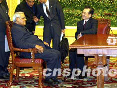 中新社北京六月二十三日电 中国国务院总理温家宝与印度总理瓦杰帕伊二十三日晚在北京人民大会堂共同签署了《中华人民共和国和印度共和国关系原则和全面合作的宣言》。