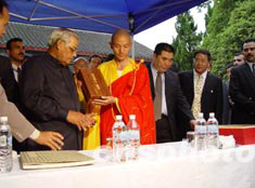 印度总理瓦杰帕伊二十五日参观“中国第一古刹”白马寺。白马寺赠送了由印度高僧摄摩腾翻译的中国第一部佛经《佛说四十二章经》。作者:何晓聪