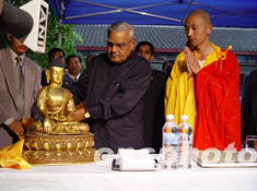 印度总理瓦杰帕伊二十五日参观位于河南洛阳的“中国第一古刹”白马寺,向白马寺赠送铜制镀金释迦牟尼佛像。作者:何晓聪