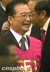 温家宝甫走入会场,即向在场人士挥手致意,且和很多工作人员握手,还与一些工作人员亲切交谈,有工作人员要求和温家宝合影,他也满足了他们的要求。温家宝穿上一件编号“6638”的红色出市背心,这是一组喻意好运的数字。
