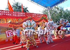 为庆祝香港回归祖国六周年,香港十个团体合作筹办的“庆祝回归祖国六周年足球嘉年华”一连三天在维园举行。图为7月1日典礼仪式上龙狮起舞,欢庆佳节。洪少葵 摄