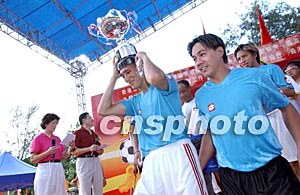 在香港庆祝回归祖国六周年足球嘉年华比赛中,获得冠军的香港渔民互助社足球队兴高彩烈上台领奖。洪少葵 摄