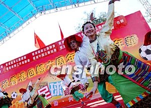 为庆祝香港回归祖国六周年,香港十个团体合作筹办庆祝活动。图为7月1日内地艺术团体表演民族舞蹈。洪少葵 摄