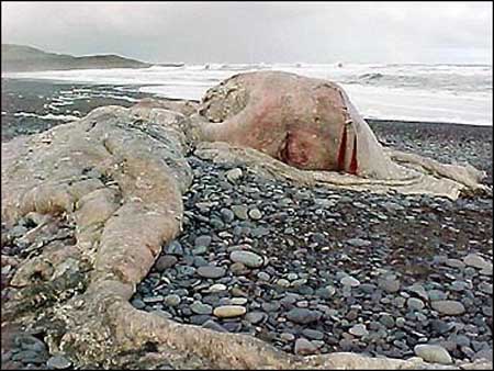 上周被海水冲上智利蒙特港附近海滩的一大块黏滑肉质物体可能是一种稀有的巨型章鱼,或者只是死去鲸鱼的一块鲸脂。智利鲸鱼保护中心表示,这具遗骸长12.4米,重约13吨,6月24日在马乌林附近的太平洋海岸被人发现,原先人们误认为是鲸鱼。