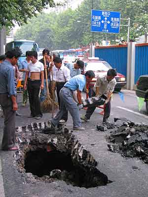 中新网7月4日电 据南京现代快报报道,昨日下午,南京新街口附近两处路面发生塌陷。塌陷虽与地铁建设没有直接的关系,但给南京地铁建设部门敲响了警钟,负责地铁建设的有关人士称,在前期预防的基础上,针对近期的梅雨,他们制定了防范措施。