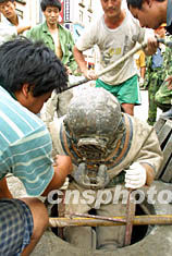 在距离事故现场百米外的中山南路路中央,高温酷热下,一名施工人员却要身穿重一百八十斤的潜水服从地面窨井下到水中,用水泥堵住地底因施工渗水而形成的漏洞。据现场施工人员透露,地下因施工渗水形成多个大洞,经过几天抢险,如今还剩最后一个,眼前这位潜水人员下水要堵的洞口直径达二点二米。