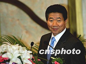 韩国总统卢武铉八日在北京钓鱼台出席中韩经济界人士欢迎总统访华午宴,中国贸促会会长万季飞(右一)表示感谢并致欢迎辞。中新社记者:郑萍萍