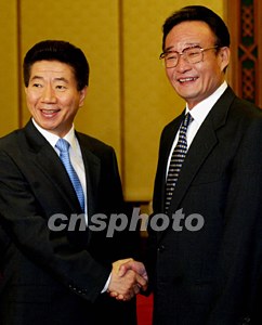 全国人大常委会委员长吴邦国八日在北京会见正在北京访问的韩国总统卢武铉一行。中新社记者:郑萍萍