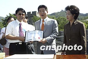 卢武铉与夫人登上北京八达岭长城,并获得登城证书。中新社记者:毛建军