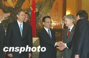 会谈开始前,温家宝在人民大会堂东门外广场为布莱尔举行了欢迎仪式。