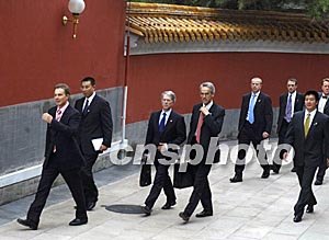 英国首相布莱尔一行七月二十一日下午步入北京中南海,会见中央军委主席江泽民。中新社记者:贾国荣