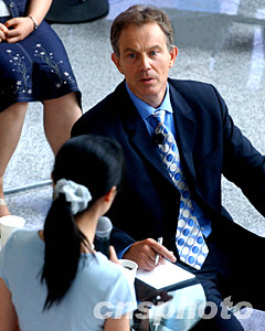 英国首相布莱尔七月二十二日在北京清华大学倾听一位研究生的提问。中新社记者:贾国荣