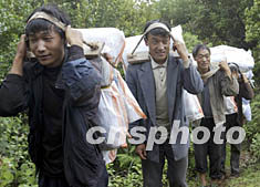 来自政府和民政部门的救灾物资二十三日陆续抵达云南大姚县,救灾人员经过崎岖险要的山间小路为地处震中的小兴厂村灾民运送物资。中新社记者:毛建军