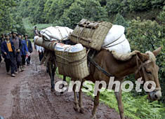 大批来自政府和社会各界的救灾物资二十三日抵达云南省大姚县地震灾区,马帮为地处大山深处的震中灾区运送生活必需品等救灾物资。中新社记者:毛建军