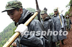 解放军官兵二十三日冒雨前往受灾严重的云南省大姚县昙华乡山区,参加抗震救灾。中新社记者:毛建军
