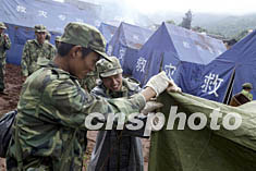 数百名解放军官兵二十三日在云南省大姚县昙华乡地震灾区为灾民搭建帐篷,帮助当地受灾民众抗震救灾。中新社记者:毛建军