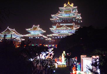 与彩灯相辉映,阅江楼也全楼亮灯,在夜幕的衬托下,光彩照人,场面十分壮观。