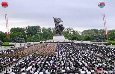朝鲜首都平壤市各界人士26日清晨举行中央报告大会,隆重纪念朝鲜祖国解放战争胜利50周年。