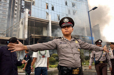 万豪大酒店附近有数家外国驻印尼大使馆。目前,酒店大楼浓烟不断,警方和消防人员已赶到出事现场,正在维持治安和进行灭火。