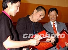 中国著名电影导演张艺谋导演的中央芭蕾舞团新版《大红灯笼高高挂》,八月八日在北京首演成功后,忙于为京城各界人士签名。中新社记者:贾国荣