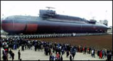 中新网8月10日电 俄罗斯《消息报》8月8日报道说,近日,在俄罗斯白海海畔北德文斯克“北方机器制造企业”的船坞上,当着俄罗斯海军总司令弗拉基米尔.库罗耶多夫的面,俄罗斯的一艘世界上绝无仅有的核潜艇顺利地下水了!
