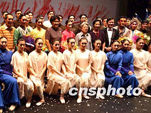 中国副总理吴仪八月十日晚观看中央芭蕾舞团新版《大红灯笼高高挂》,与导演张艺谋和创作演出人员合影祝贺首演成功。中新社记者:贾国荣