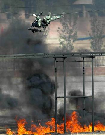 第一部分是新训法、新战法演练,主要进行智勇格斗、灵活驾驶、精确排爆、快速攀登、安全越障等基础课目的演示,反恐分队和特战队员们以灵敏的反应和不凡的身手,显示了他们过硬的军事素质。