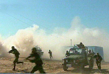 在首先进行的城镇清剿、解救人质的实兵演习中,面对袭击城镇、劫持中外人质的武装恐怖分子,联合指挥部指挥反恐特战分队、陆军航空兵和武警特种分队,分四路对发生恐怖暴力事件的城镇实施合围,开展拉网式清剿。当恐怖分子退缩到一栋楼时,突击队员对恐怖分子展开攻击,另一队突击队员也乘直升机抵达现场。经过激战,成功解救了被劫人质。