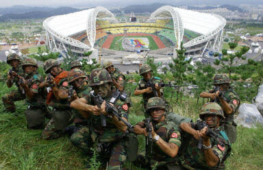 2003年世界大学生运动会将于8月21日至31日在韩国大邱举行。为了保证即将在开幕的第22届世界大学生运动会的安全,韩国将动用7,400名警察日夜守卫在各地赛场周围,以保证本届运动会在安全方面万无一失。图为8月19日韩国士兵在大邱主会场附近巡逻。