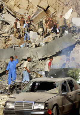 联合国雇员告诉福克斯新闻,爆炸发生时大楼里至少还有150名工作人员。福克斯新闻记者丹-斯普林杰自现场发回的报道称,两层高的“运河宾馆”有整整一个角被炸掉!据称,爆炸的中心位置好象位于宾馆的大厅。(章田)