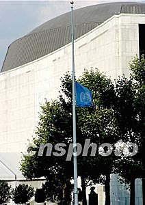 联合国驻巴格达总部大楼十九日遭炸弹袭击,二十人在爆炸中丧生,纽约联合国总部随即降半旗致哀。中新社记者:赵海燕