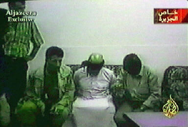 中新网8月21日电 “半岛”电视台新闻节目抓图。画面上为8月20日一名库尔德战士看守着萨达姆的得力助手--伊拉克副总统塔哈·亚辛·拉马丹。库尔德人于8月19日在摩苏尔市的突袭行动中抓获了拉马丹。拉马丹在美军55人扑克牌通缉令中名列第20位。至此,通缉名单上已有38人被捕或被击毙。(春风)