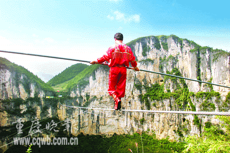 中新网重庆8月22日电(王小毅 姜道策)今天,“高空王子”阿迪力走钢丝穿过了有“天下第一坑”之称的奉节天坑,创造了走钢丝离地面绝对高度六百六十二米的新世界纪录。