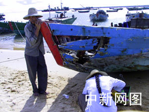 中新社海口八月二十六日电(记者关向东王辛莉通讯员余茂生)海口新海村渔民陈家位,一脸疲惫地依在刚打捞出水的自家渔船船头,船头左侧一大洞,后舱甲板翻倒在沙滩上,两年前花七万元人民币造的渔船因一场台风转眼间散架成一堆废木。