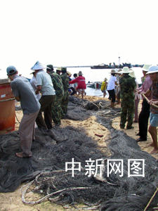 记者在现场看到:海南省海事局派出打捞船在紧张作业,来自驻地的海军潜水员忙着帮渔民将缆绳系上水底的渔船,而秀英区武装部的战士与当地的干部、村民一道拉缆,将刚刚出水的船只拖上岸。