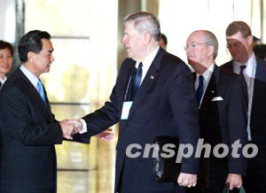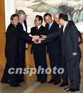 中国代表团团长、外交部副部长王毅在钓鱼台国宾馆迎候各国团长,会谈比预定的九点稍晚了几分钟。会谈开始前,六方代表团团长在钓鱼台芳菲苑大厅合影,随后步入会谈现场。据本社记者现场观察,六条长桌首尾相接,围成一个六角大桌,六国代表团围着六角大桌落座。(完)