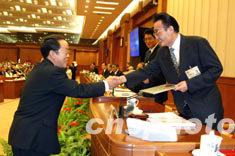 十届全国人大常委会第四次会议今天上午在北京人民大会堂举行,全国人大常委会副委员长李铁映在会上主持了任命书颁发仪式。