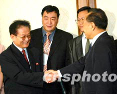 李肇星外长与韩、日、朝、俄、美代表团团长及大使等一一握手、寒暄,大家很配合地摆出好的角度,让少数获得特许进来采访的记者们拍照。