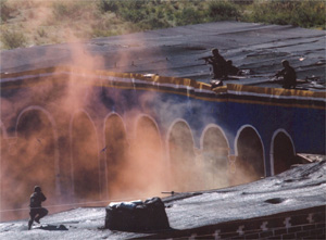 中新网9月2日电 “防卫、救援、打击”作为我军参加反恐怖斗争的三项基本任务,经过试验部队创造性地探索,已经成为军队反恐怖训练的基本内容和课题。8月23日、24日,解放军报记者来到新疆某地的山野间,在3个模拟城市和乡镇的反恐怖斗争的训练场上,目击了解放军、武警部队协助地方政府,与公安和民兵等地方力量密切配合,稳、准、狠地打击“恐怖分子”的场面,看到了人民子弟兵全心全意保护人民群众和国家财产的动人情景。