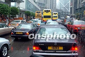 香港天文台二日下午悬挂八号烈风信号,中环一带交通堵塞。中新社记者:钱兴强