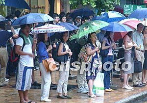 受台风影响,香港二日下午交通堵塞,许多乘客在雨中耐心等待乘车。中新社记者:钱兴强
