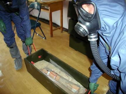具体的处理程序是:金属探测————先通过电磁探测,测出毒弹掩埋的准确边际,确定挖掘的方位;挖掘作业————使用铜针、铜铲等器具,小心将已经锈蚀、渗漏的毒气弹挖掘出来;冷却处理————将挖掘出的毒气弹放置到零下40℃的冷藏柜,进行12个小时的冷却,使毒气弹温度降到零下30℃;X光鉴别————通过大功率X光鉴别,搞清楚毒弹内部结构;弹、药分离———将弹体切割;外形鉴别;密封包装。