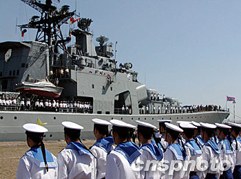 中国海军北海舰队某驱逐舰支队“哈尔滨”号导弹驱逐舰执行海上礼仪并陪访。“哈尔滨”舰曾于1996年7月26日至8月2日,应俄罗斯海军邀请参加俄海军建军300周年庆祝活动,当时“潘捷列耶夫海军上将”号大型反潜舰是“哈尔滨”舰的陪访舰。(米晋国)