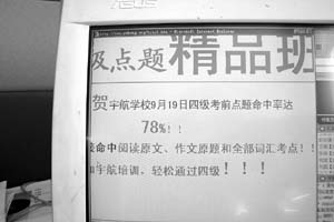 据《京华时报》报道,北京某高校刚刚参加完英语四级考试的小鲍反映,前天,不少同学在地质大学看到当晚在该校将举行“四级考试考前点题培训”的海报,入场券50元,举办方为北京宇航考试培训学校。“这次培训点中了试题中大概50分的内容!”