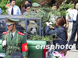 经过饲养员的精心照顾,国宝们五分钟后都平静下来,津津有味地大口吃着竹子、苹果。现在大熊猫已适应了新环境,在自己的新居里休息。