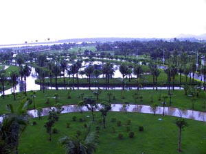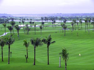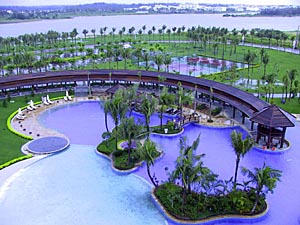 事实上,当记者站在酒店总统套房的大露台上,心旷神怡的感觉真是扑面而来。在这个露台上俯瞰酒店的生态泳池,绿色的岛屿小品与棕色木质烧烤回廊讲述着回归自然的故事;视野穿过起伏的高尔夫球场,可以远眺南中国海的碧波。一条被河流冲积泥沙与外海海浪共同作用而成的沙堤——玉带滩,蜿蜒三公里将万泉河、龙滚河、九曲江三江入海口分成了内外咸淡两海,其中内海之中形成若干个小岛,在眼前演绎着丰富而多变的江、河、湖、海、岛屿、山脉的水域景观。